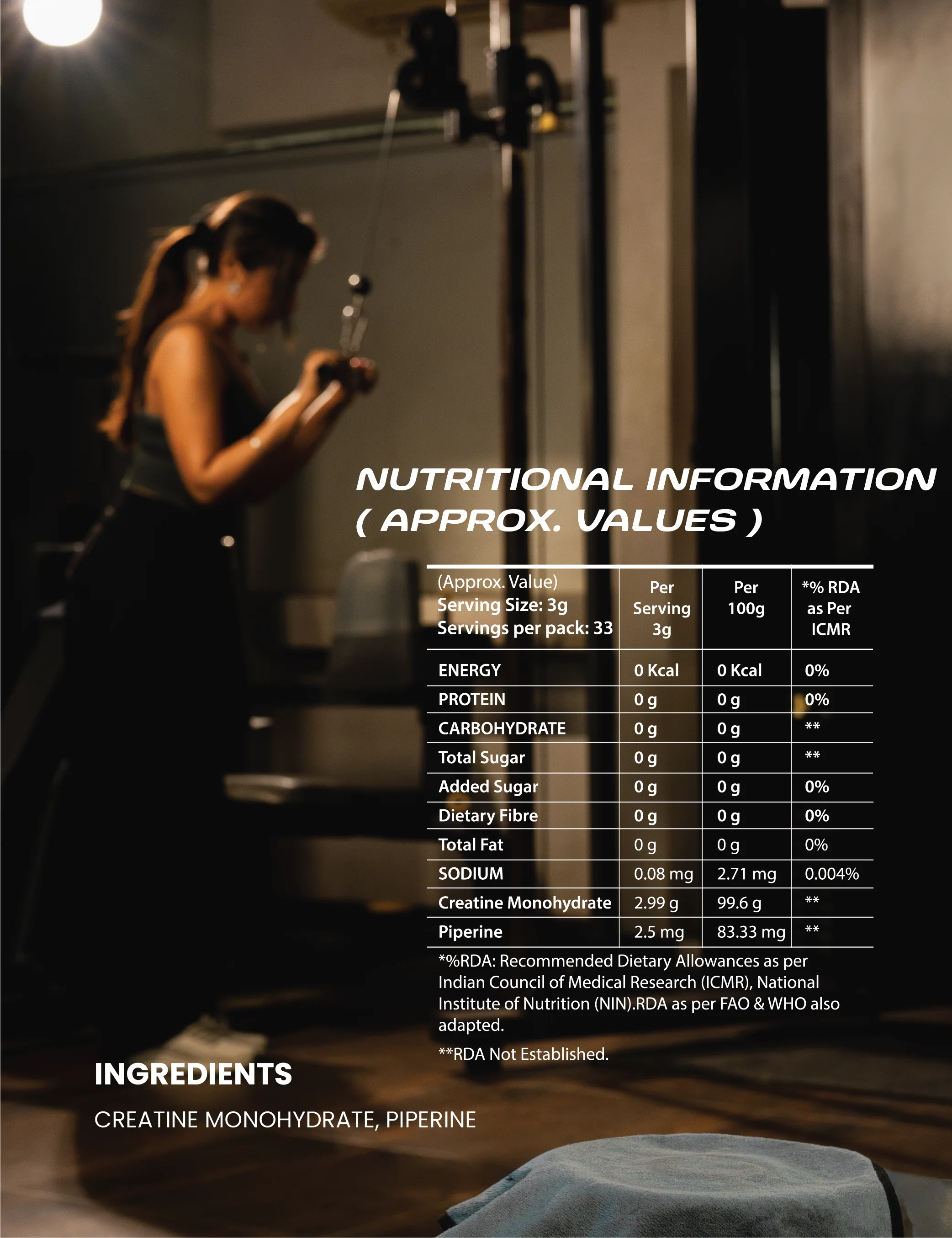 - Key Ingredients: 2.99g Creatine Monohydrate, 2.5mg BioPerine®