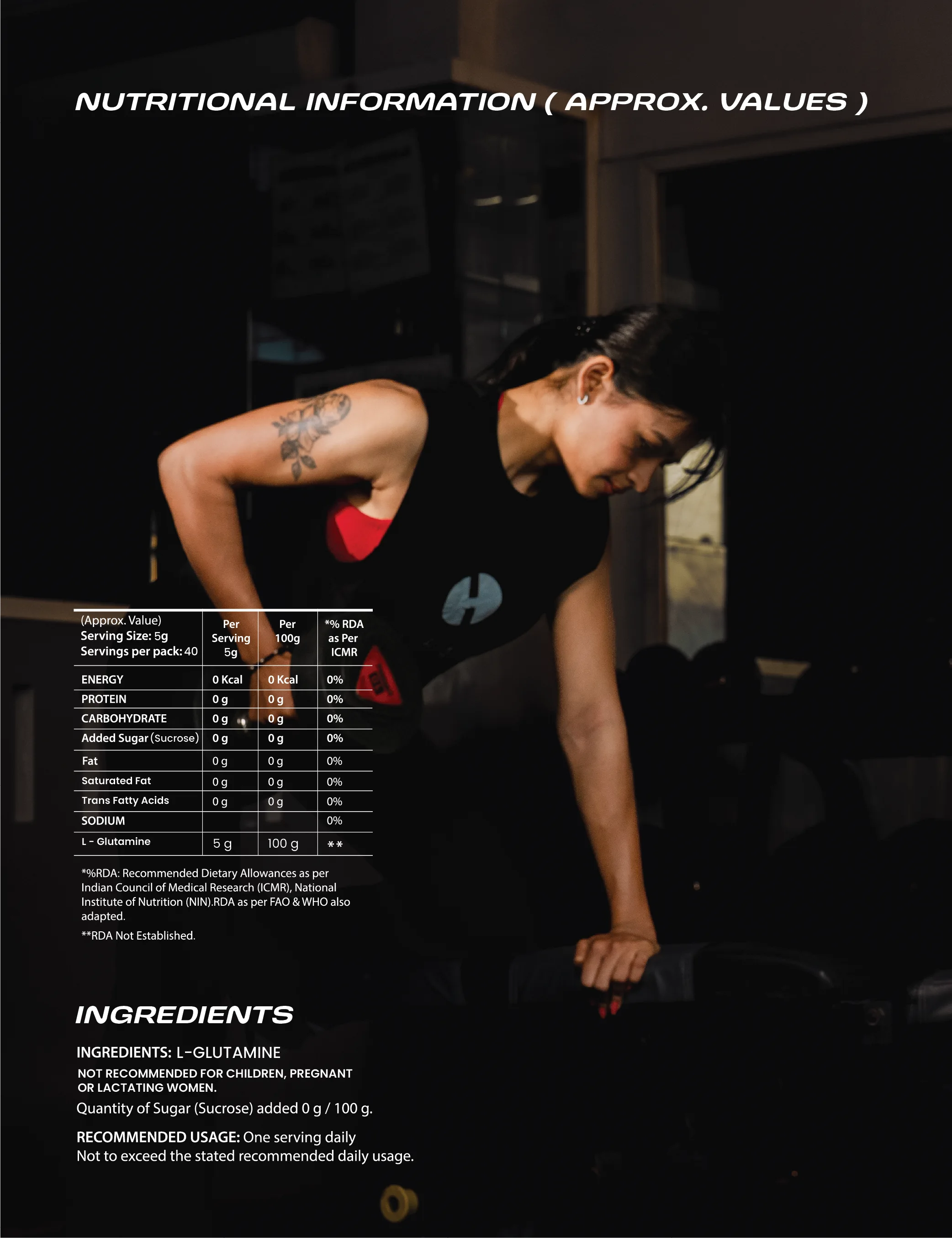 - 5g Pure L-Glutamine Per Scoop: Supports muscle repair, reduces post-workout soreness, and enhances immune function.