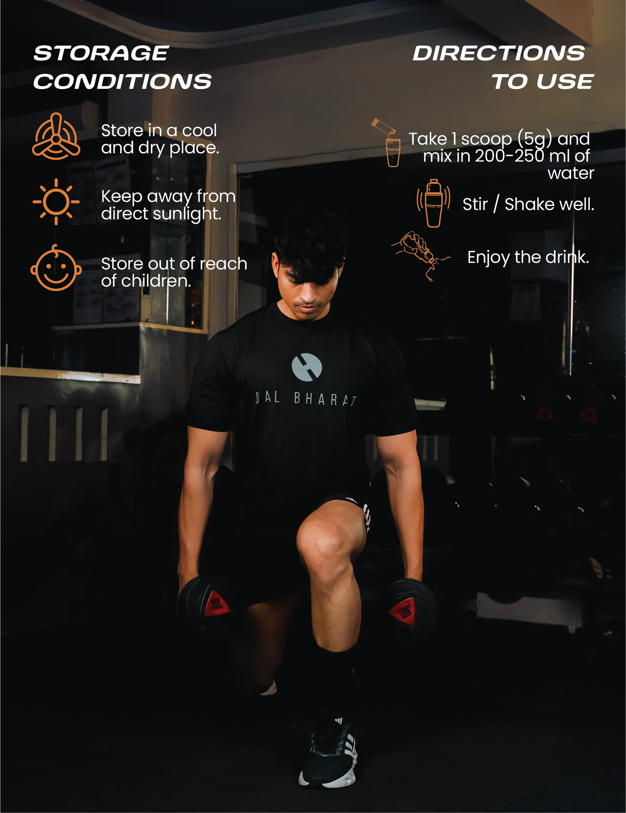 Mix 1 scoop (5g) of Bal Bharat L-Glutamine with 200-250ml of water, juice, or your favorite shake. For best results, consume post-workout or between meals to support muscle recovery.