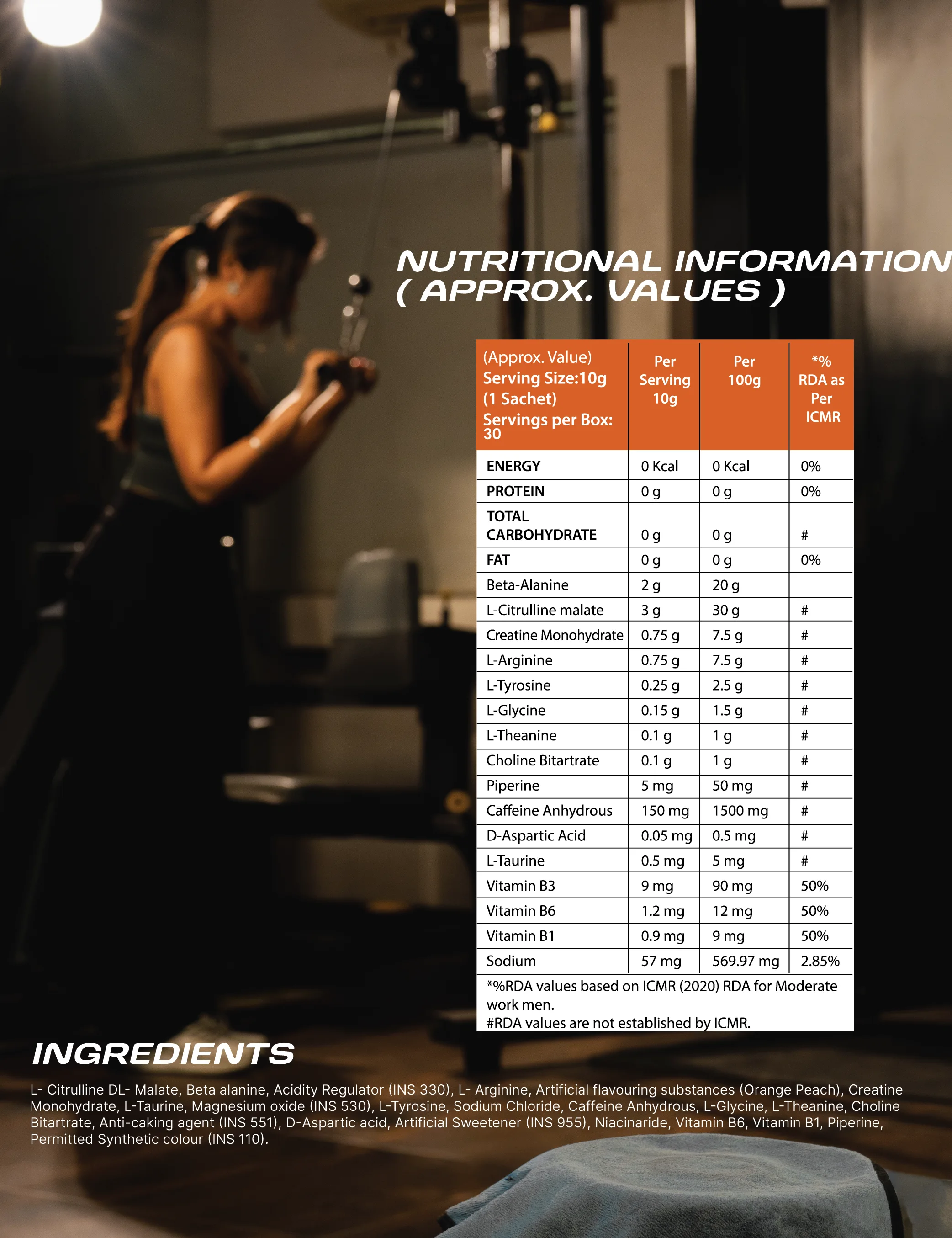 L-Citrulline Malate (3g), Beta-Alanine (2g), Creatine Monohydrate (0.75g), L-Arginine (0.75g), L-Tyrosine (0.25g), Caffeine (150mg), L-Taurine (0.5mg), Vitamins B3, B6, B1, Pepper Extract (5mg), Natural Flavoring, and Sweeteners.